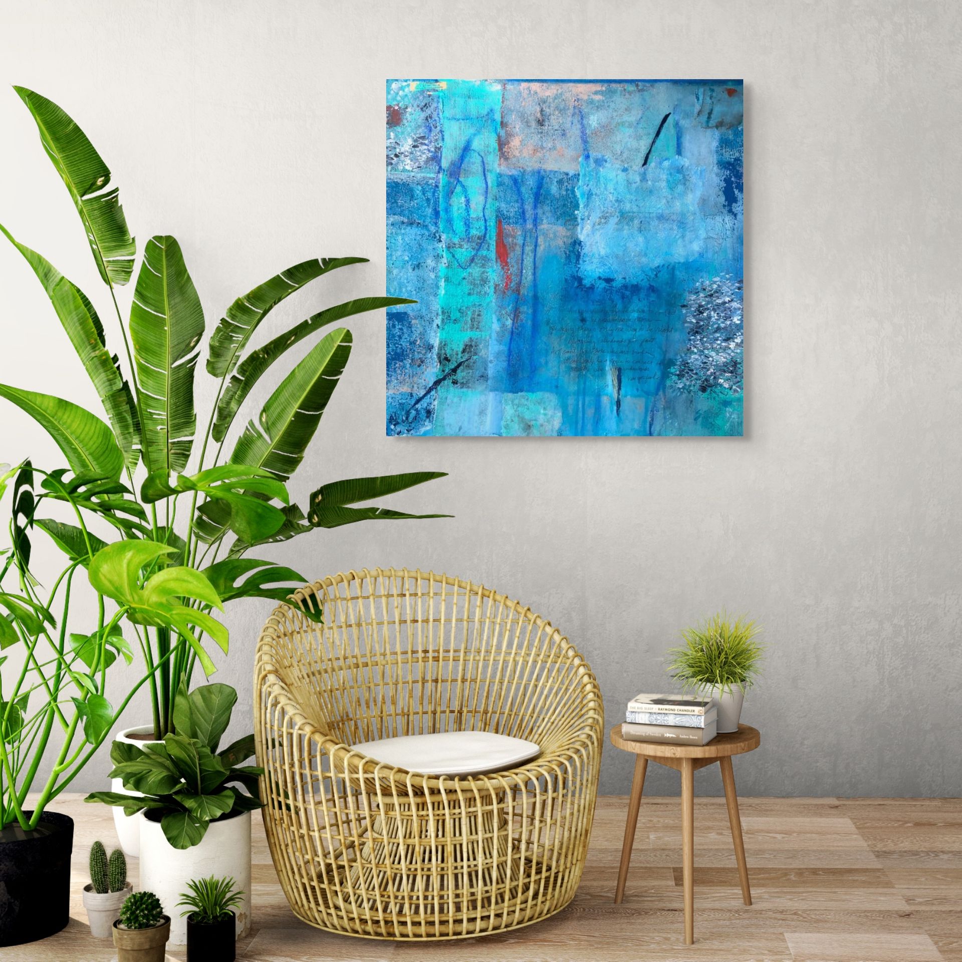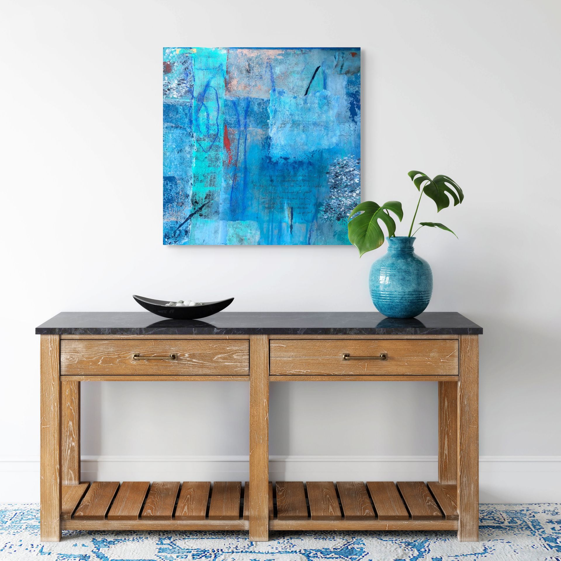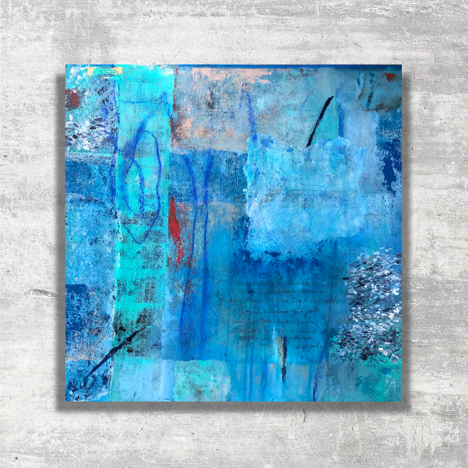 When I began painting Composition With Poetry #2, I couldn’t see what it would evolve into. At that point I had committed to limiting my palette to blue – studying how the color shifts depending on how I changed the complementary pigment I added to it.