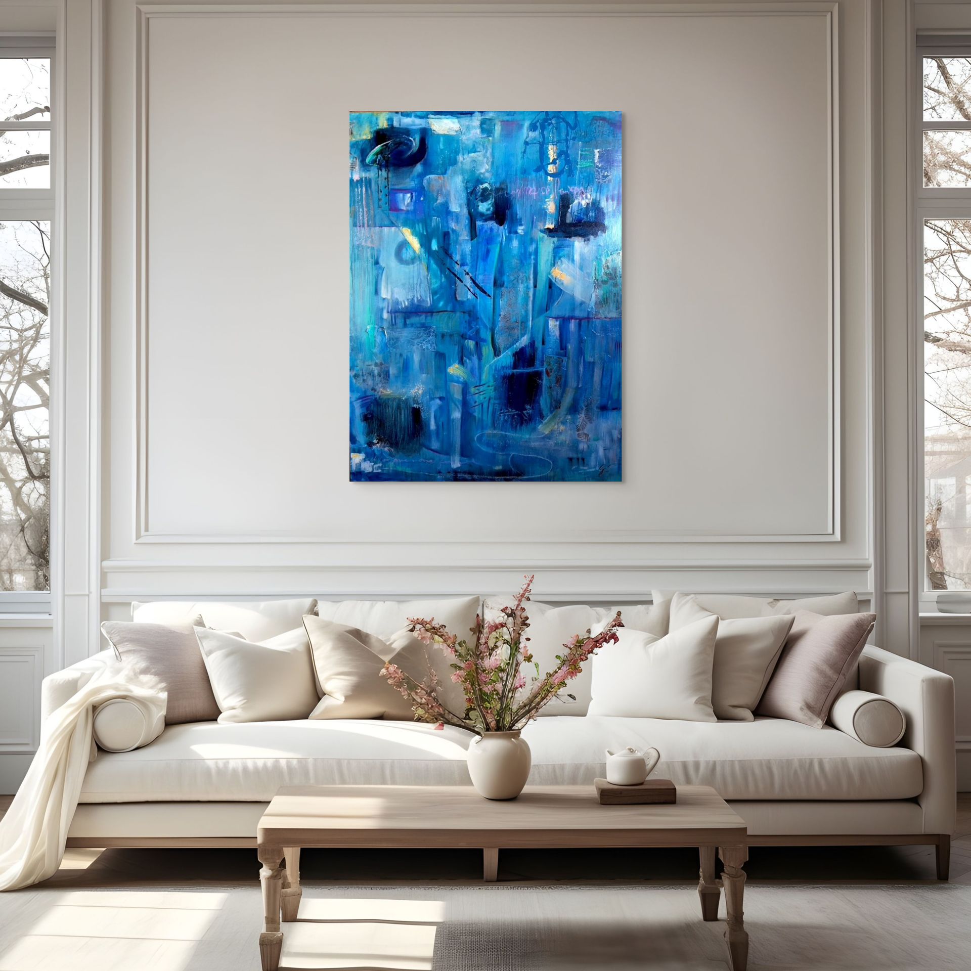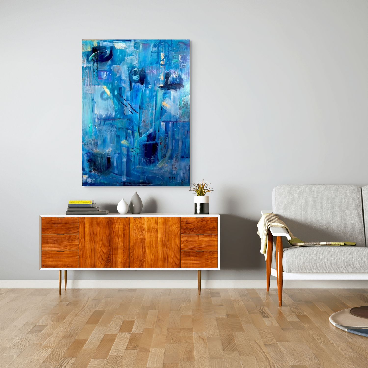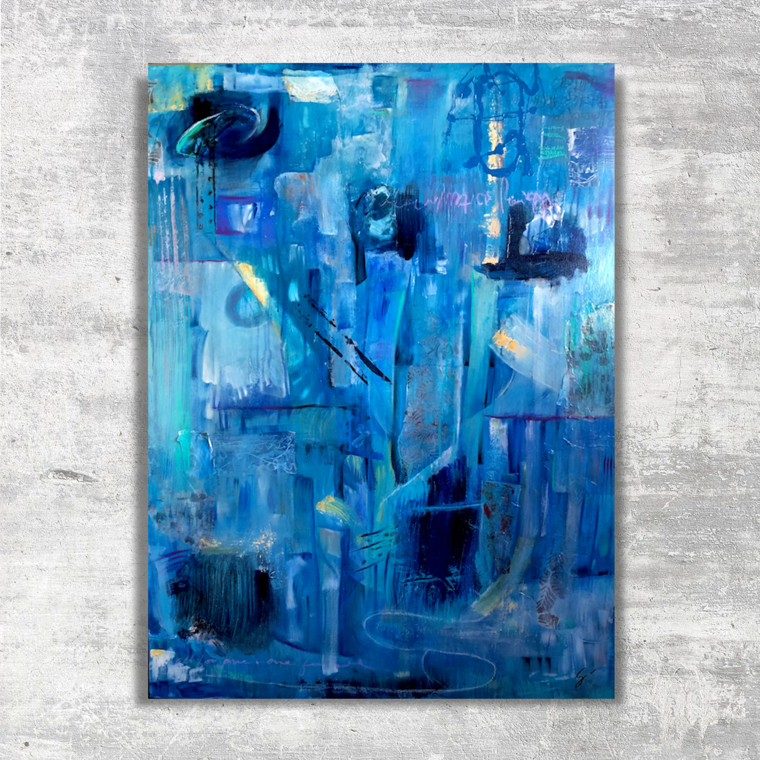 Painted on gallery-wrapped canvas, First I, Then We, Now Us can be framed or hung as is.